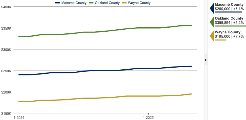 How have the values changed in my neighborhood? Below are the median sales prices for five popular Detroit suburbs in May 2025, along with the % change over the past 12 months.